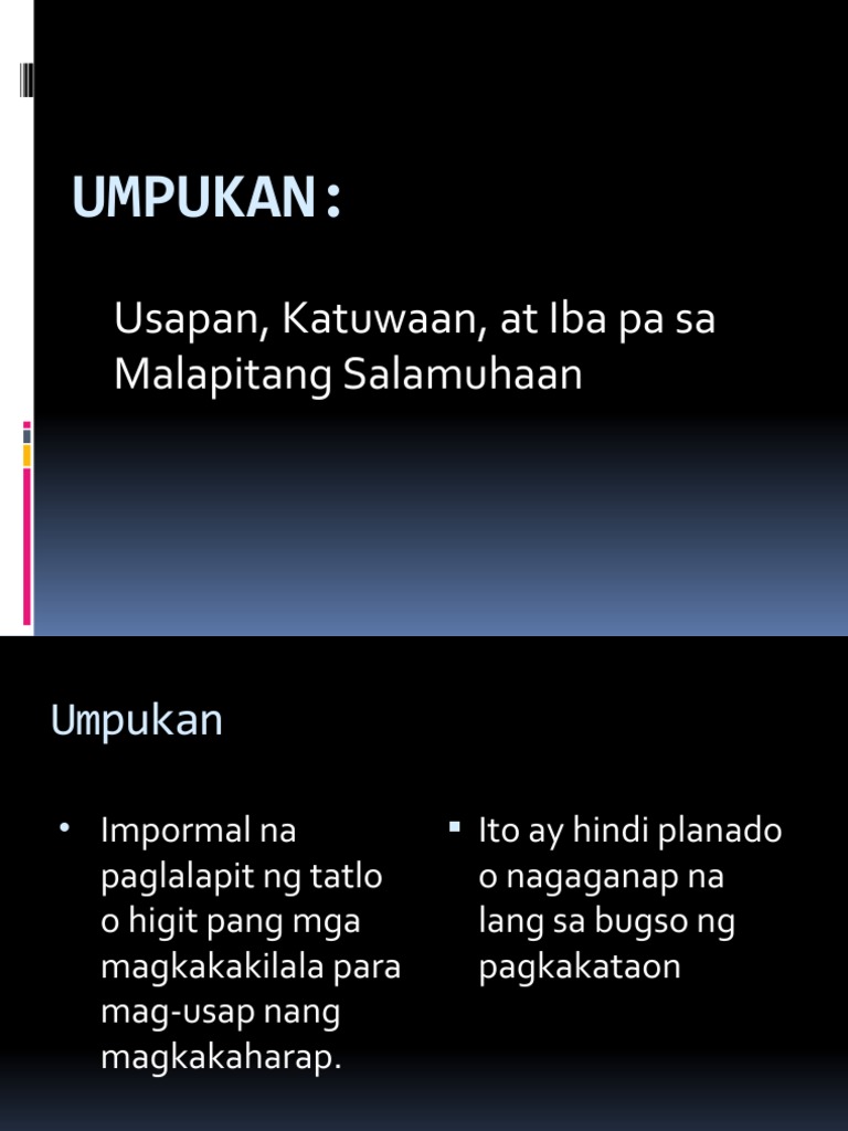 Ginagamit din ang umpukanpara ilarawan ang kakapalan o karamihan ng tao sa isang grupo o pangkat. Ang tayutay ay isang matalinghagang pahayag na nagbibigay ng mabisang kahulugan upang lalong maging mabisa at makulay ang isang paglalarawan. Uunahin natin alamin kung ano talaga ang kahulugan ng wika.