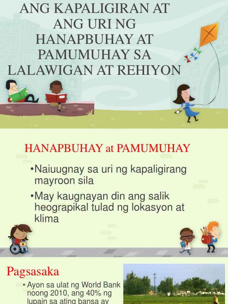 Maraming manggagawa rito sapagkat madaming produkto ang kailangan i-prodyus. Epekto ng terorismo sa mga tao at sa kanilang mga hanapbuhay. ANG URI NG HANAPBUHAY AT PAMUMUHAY SA LALAWIGAN AT REHIYON HANAPBUHAY at PAMUMUHAY Naiuugnay sa uri ng kapaligirang mayroon sila May kaugnayan din ang salik heograpikal tulad ng lokasyon at klima Pagsasaka Ayon sa ulat ng World Bank noong 2010 ang 40 ng lupain sa ating bansa ay nagagamit sa pagtatanim Ang mga taniman o sakahan ay karaniwang.