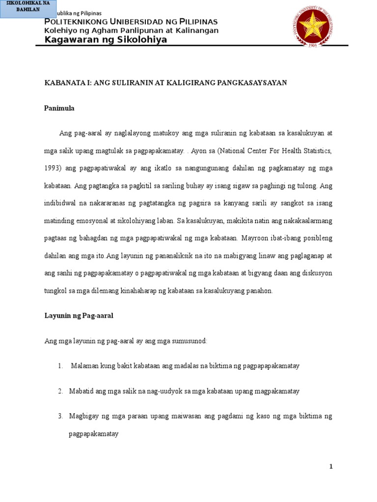 Dahilan Ng Pagpapakamatay Ng Kabataan Pdf